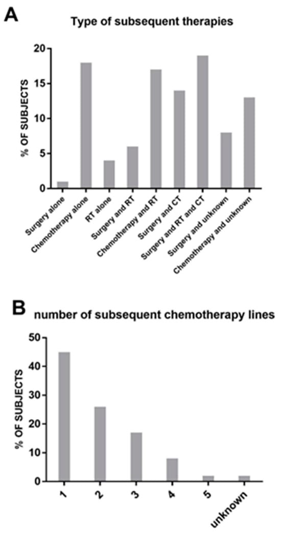 (A): List and frequency (in percentage) of therapies received post-protocol. (B): Number of subsequent lines of chemotherapy received post-protocol. (C): Type of drug used in second-line chemotherapy.