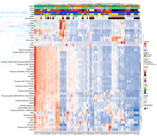 A LMM analysis revealed that 37 of the 46 proteins analyzed were differentially expressed between the tumor periphery and the tumor center (Figure 3).