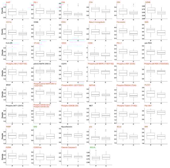 Tumor periphery and center are characterized by a high number of differentially expressed proteins. Box plots showing the expression of 46 proteins in the tumor periphery (P) and the tumor center (C). LMM analysis of log10 transformed counts was used to assess statistically significant differences. Proteins significantly upregulated in the tumor periphery are highlighted in red. Only two proteins (BAD and BCLXL) were significantly upregulated in the tumor center (green).