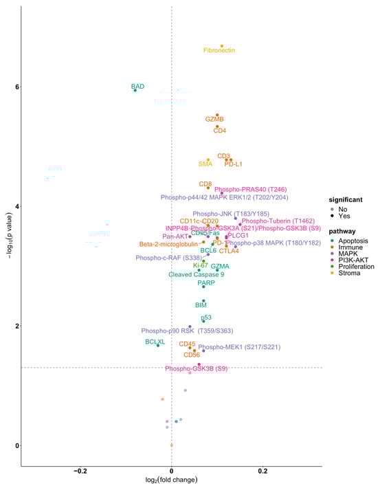 Unsupervised hierarchical cluster analysis revealed two major protein expression clusters (Figure 2). Cluster 1 showed predominantly an upregulation of protein expression, while cluster 2 was largely characterized by a downregulation or no change of protein expression. ROIs in cluster 1 were found to localize predominantly to the tumor periphery (77%), whereas ROIs in cluster 2 showed a more balanced association with tumor regions (44% tumor periphery vs. 56% tumor center). The differences between the two clusters in terms of ROI localization were statistically significant (p = 0.002, Fisher’s Exact test).