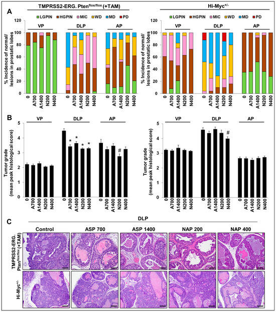 Effects of aspirin and naproxen interventions on cancer progression in different prostate lobes of TMPRSS2-ERG fusion-driven and non-fusion-driven Hi-Myc+/− PCa models. NSAID effects on (A) % incidence of pre-/neoplastic and adenocarcinoma lesions, (B) tumor grades of histopathological lesions in different prostate lobes of TMPRSS2-ERG. Ptenflox/flox (+TAM) (left-panel), and Hi-Myc+/− (right-panel) mice. (C) Representative pictographs (×100, H&E images) depicting representative histopathological changes in the dorsolateral prostate of TMPRSS2-ERG. Ptenflox/flox (+TAM) and Hi-Myc+/− mice after aspirin and naproxen interventions. Scale bar represents 100 µm. Doses used were aspirin 700 ppm (A700); aspirin 1400 ppm (A1400); naproxen 200 ppm (N200); naproxen 400 ppm (N400). The maximum histological score for the prostate lobe was used to calculate a mean tumor grade for the group. VP, ventral prostate; DLP, dorsolateral prostate; AP, anterior prostate; LGPIN, low-grade prostatic intraepithelial neoplasia; HGPIN, high-grade prostatic intraepithelial neoplasia; MIC, micro-invasive carcinoma; WD, well-differentiated (adenocarcinoma); MD, moderately differentiated (adenocarcinoma); PD, poorly differentiated (adenocarcinoma). Quantified data are represented as Columns (mean for each group): bars represent SEM. *, p ≤ 0.001; #, p ≤ 0.01.