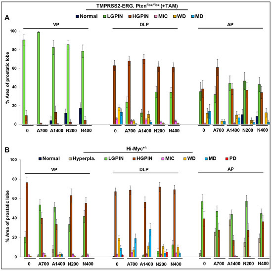 Effects of aspirin and naproxen interventions on % area of lesions in different prostate lobes of TMPRSS2-ERG fusion-driven and non-fusion-driven Hi-Myc+/− PCa models. NSAID effects on % area of different prostate lobes displaying normal, pre-/neoplastic, adenocarcinoma lesions in (A) TMPRSS2-ERG. Ptenflox/flox (+TAM), and (B) Hi-Myc+/− mice. Doses used were aspirin 700 ppm (A700); aspirin 1400 ppm (A1400); naproxen 200 ppm (N200); naproxen 400 ppm (N400). Data are presented as the % area of the prostatic lobe of each group. VP, ventral prostate; DLP, dorsolateral prostate; AP, anterior prostate; LGPIN, low-grade prostatic intraepithelial neoplasia; HGPIN, high-grade prostatic intraepithelial neoplasia; MIC, micro-invasive carcinoma; WD, well-differentiated (adenocarcinoma); MD, moderately differentiated (adenocarcinoma); PD, poorly differentiated (adenocarcinoma). Quantified data are represented as Columns (mean for each group): bars represent SEM. (Statistical data in Supplementary Tables S2 and S3).