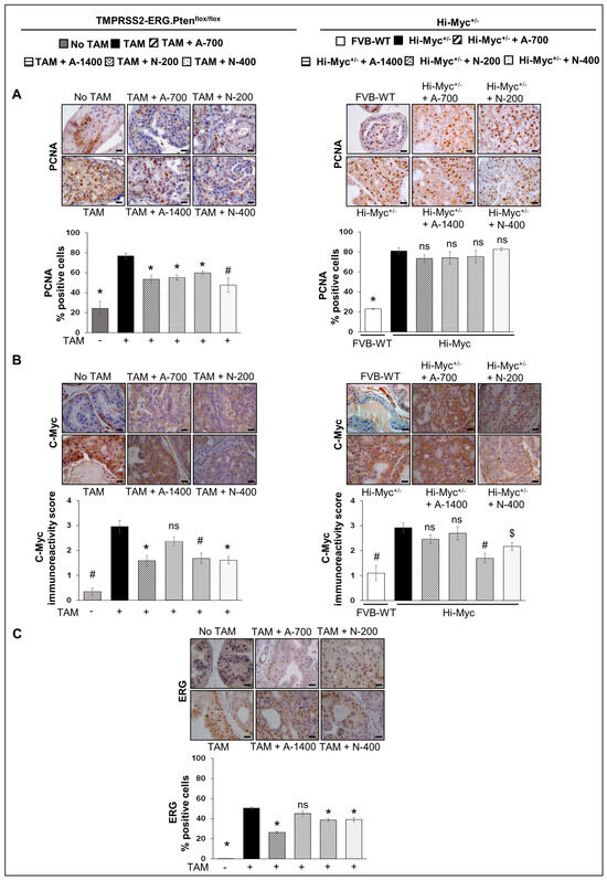 Differential effects of aspirin and naproxen intervention on the expression of proliferative markers and ETS transcription factor (ERG) in the prostate of TMPRSS2-ERG fusion-driven and non-fusion-driven Hi-Myc+/− PCa models. NSAID effects on (A) PCNA, (B) c-Myc in dorsolateral prostate of TMPRSS2-ERG. Ptenflox/flox (+TAM) (left-panel), and Hi-Myc+/− (right-panel) mice. (C) ERG expression in dorsolateral prostate of TMPRSS2-ERG. Ptenflox/flox (+TAM). Representative pictographs (×400 magnification) of DAB-stained prostate tissues showing brown-colored positive staining (PCNA-nuclear, c-Myc-cytoplasmic/nuclear, ERG-nuclear) are shown above each panel. Scale bar represents 20 µm. Doses used were aspirin 700 ppm (A700); aspirin 1400 ppm (A1400); naproxen 200 ppm (N200); naproxen 400 ppm (N400). Age-matched NSAID untreated mice [(No-TAM) and FVB (WT)] represent respective controls for each strain. Quantified data are represented as Columns (mean for each group): [TMPRSS2-ERG. Ptenflox/flox (+TAM) and Hi-Myc+/− (untreated and NSAID-fed) n = 10 tissues/group; No-TAM: n = 4 tissues; FVB (WT): n = 3 tissues; bars represent SEM. *, p ≤ 0.001; #, p ≤ 0.01; $, p ≤ 0.05; ns, p > 0.05.