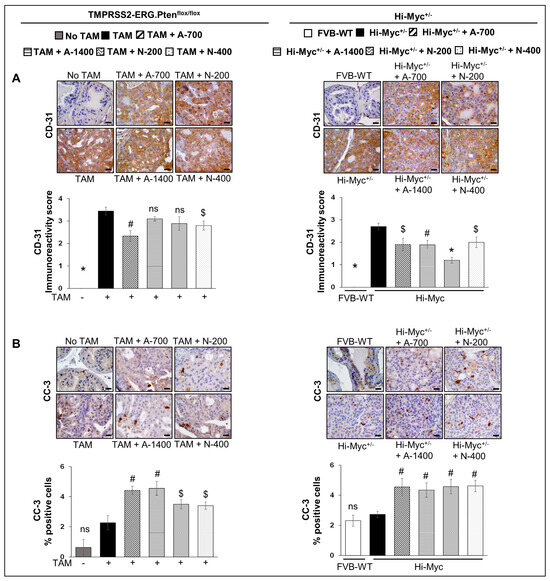 Differential effects of aspirin and naproxen intervention on angiogenesis and apoptosis markers in the prostate of TMPRSS2-ERG fusion-driven and non-fusion-driven Hi-Myc PCa models. NSAID effects on (A) CD-31 (PECAM-1) angiogenesis marker, and (B) cleaved-caspase-3 (apoptosis marker) in dorsolateral prostate of TMPRSS2-ERG. Ptenflox/flox (+TAM) (left-panel), and Hi-Myc+/− (right-panel) mice. Representative pictographs (×400 magnification) of DAB-stained prostate tissues showing brown-colored positive staining (CD-31: endothelial membrane junction, c-caspase-3: cytoplasmic/nuclear) are shown above each panel. Scale bar represents 20 µm. Doses used were aspirin 700 ppm (A700); aspirin 1400 ppm (A1400); naproxen 200 ppm (N200); naproxen 400 ppm (N400). Age-matched NSAID untreated mice [(No-TAM) and FVB (WT)] represent respective controls for each strain. Quantified data are represented as Columns (mean for each group): [TMPRSS2-ERG. Ptenflox/flox (+TAM) and Hi-Myc+/− (untreated and NSAID-fed) n =10 tissues/group; No-TAM: n = 4 tissues; FVB (WT): n = 3 tissues; bars represent SEM. *, p ≤ 0.001; #, p ≤ 0.01; $, p ≤ 0.05; ns, p > 0.05.