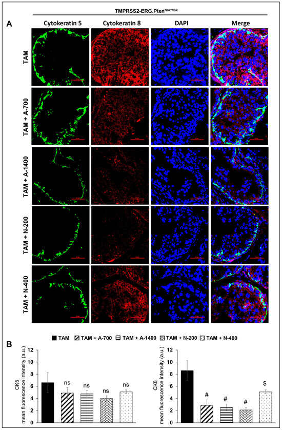 Differential effects of aspirin and naproxen intervention on the cell type distribution (basal, luminal) in the prostate of TMPRSS2-ERG fusion-driven and non-fusion-driven Hi-Myc+/− PCa models. NSAID effects on the expression pattern (dual immunofluorescence staining) of basal cell marker CK-5 (green) and luminal cell marker CK-8 (red) in dorsolateral prostate of (A) TMPRSS2-ERG. Ptenflox/flox (+TAM), and (C) Hi-Myc+/- mice. Nuclei are stained blue with DAPI. Scale bar represents 50 µm. (B,D) Quantified data for mean fluorescence intensity are represented as Columns [CK-5 (left panel) and CK-8 (right panel)]: mean for each group from 10 fields (×600) per 2 tissue sections; bars represent SEM. *, p ≤ 0.001; #, p ≤ 0.01; $, p ≤ 0.05; ns, p > 0.05. CK, cytokeratin. Doses used were aspirin 700 ppm (A700); aspirin 1400 ppm (A1400); naproxen 200 ppm (N200); naproxen 400 ppm (N400).