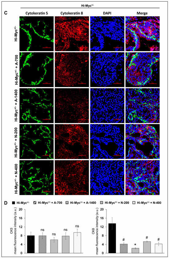 For immunohistochemistry (IHC), after deparaffinization, tissue sections were subjected to staining using specific primary/secondary antibodies (based on streptavidin-biotin system), followed by 3,3′-diaminobenzidine (DAB) staining, as per the guidelines provided by the manufacturer, and following previously established protocols [18,20]. Primary antibodies used were from Abcam, Waltham, MA, USA; [PCNA (#ab29), ERG (#ab92513), CK5 (3ab52635)], NFκB (#ab16502)]; and Santa Cruz Biotechnology Inc., Dallas, TX, USA; [androgen receptor (#sc816), c-Myc (#sc-40), prostein (#sc393069), PECAM-1/CD-31 (#sc376764), COX-2 (#sc-1747), COX-1 (#sc-1752), vimentin (V9 #sc-6260), CK8 (#sc-8020); Cell Signaling Technology, Danvers, MA, USA; E-cadherin (#3195), cleaved-caspase 3 (#9661)]. Biotinylated secondary antibodies used were from Dako/Agilent, Santa Clara, CA, USA; [rabbit anti-mouse (#E0464), rabbit anti-rat (#E0468), and goat anti-rabbit (#E0432)]; and Santa Cruz Biotechnology Inc., Dallas, TX, USA; [rabbit anti-goat #sc-2774]. Fluorescent tagged-secondary antibodies used were from Invitrogen, Waltham, MA, USA; [goat anti-mouse-Alexa Fluor 647 (#A21236), goat anti-rabbit-Alexa Flour 488 (#A11008)]. Since the most aggressive pathologies were observed in the DLP in both models, the IHC analysis was mostly conducted on these tissues [12].