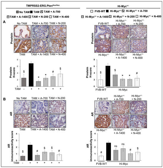 H-Score analysis for prostein expression was calculated as [% proportion area of the prostate (positive for prostein expression) × immunoreactivity score (prostein perinuclear intensity)]. For H-score calculations, the % proportion area was given arbitrary scores (<1% = 0, ≤2–10% = 1, ≤11–25% = 2, ≤26–50% = 3, ≤51–100% = 4). Variations among the groups were ascertained through either ANOVA or unpaired t-tests, depending on relevance, followed by Tukey’s test for conducting multiple comparisons. Mean values accompanied by their corresponding standard error of the mean (SEM) are presented to represent quantitative data. Microscopic evaluations were performed using a Zeiss Axioscope 2 microscope (Carl Zeiss, Jena, Germany). Photomicrographs were captured using an AxioCam MrC5 camera (Carl Zeiss, Jena, Germany) as shared in relevant figures and Supplementary Figure S2. Comparative data of IHC analysis in age-matched non-Cre induced TMPRSS2-ERG. Ptenflox/flox or wild-type (FVB) control mice fed either a control diet or NSAID-supplemented diets are shown in Supplementary Figures S3–S6.