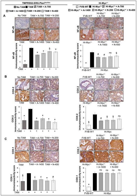 Differential effects of aspirin and naproxen intervention on the expression of inflammation-related markers in the prostate of TMPRSS2-ERG fusion-driven and non-fusion-driven Hi-Myc PCa models. NSAID effects on (A) NFκB (total p65), (B) COX-2, and (C) COX-1 expression in dorsolateral prostate of TMPRSS2-ERG. Ptenflox/flox (+TAM) (left-panel), and Hi-Myc+/− (right-panel) mice. Representative pictographs (×400 magnification) of DAB-stained prostate tissues showing brown-colored positive staining (NFκB—cytoplasmic/nuclear intensity, COX-2, and COX-1: cytoplasmic intensity) are shown above each panel. Scale bar represents 20 µm. Doses used were aspirin 700 ppm (A700); aspirin 1400 ppm (A1400); naproxen 200 ppm (N200); naproxen 400 ppm (N400). Age matched-NSAID untreated mice [(No-TAM) and FVB (WT)] represent respective controls for each strain. Quantified data are represented as Columns (mean for each group): [TMPRSS2-ERG. Ptenflox/flox (+TAM) and Hi-Myc+/− (untreated and NSAID-fed) n = 10 tissues/group; No-TAM: n = 4 tissues; FVB (WT): n = 3 tissues; bars represent SEM. *, p ≤ 0.001; #, p ≤ 0.01; $, p ≤ 0.05; ns, p > 0.05.