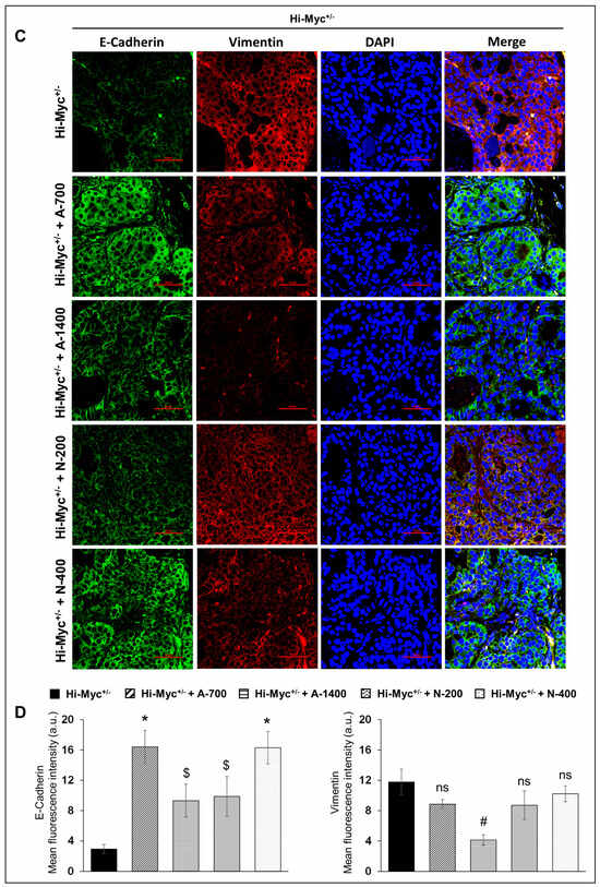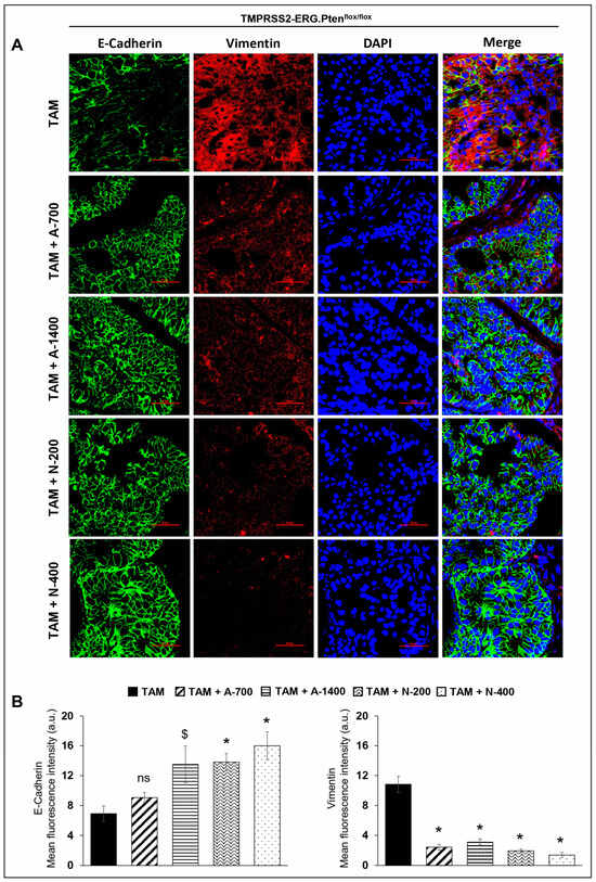 Differential effects of aspirin and naproxen intervention on the expression of epithelial to mesenchymal transition markers in the prostate of TMPRSS2-ERG fusion-driven and non-fusion-driven Hi-Myc+/− PCa models. NSAID effects on the expression pattern (dual immunofluorescence staining) of E-cadherin (green) and vimentin (red) in dorsolateral prostate of (A) TMPRSS2-ERG. Ptenflox/flox (+TAM), and (C) Hi-Myc+/− mice. Nuclei are stained blue with DAPI. Scale bar represents 50 µm. (B,D) Quantified data for mean fluorescence intensity are represented as Columns [E-cadherin (left panel) and vimentin (right panel)]: mean for each group from 10 fields (×600) per 2 tissue sections; bars represent SEM. *, p ≤ 0.001; #, p ≤ 0.01; $, p ≤ 0.05; ns, p > 0.05. Doses used were aspirin 700 ppm (A700); aspirin 1400 ppm (A1400); naproxen 200 ppm (N200); naproxen 400 ppm (N400).