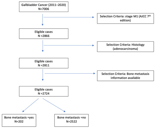GBC is the most common form of biliary tract cancer (BTC)—a group that also includes the intrahepatic, perihilar, and extrahepatic forms of cholangiocarcinoma—and has the shortest associated median survival duration of the group [4]. This high mortality is attributed to the aggressive nature of the malignancy, insidious onset of the disease, absence of effective screening protocols, and a limited range of available therapeutic interventions. As such, the majority of patients present with metastatic disease upon diagnosis. The most common sites of metastasis are the liver, regional lymph nodes, and peritoneum, with only 20% of cases characterized by non-abdominal metastasis, primarily to the lung and brain [5]. Bone metastasis is the least common manifestation of GBC; however, the incidence can be as high as 10%, as evidenced in an autopsy series [6]. Given the lack of standardized screening measures for detecting bone metastasis, a comprehensive understanding of the incidence and prognostic significance of skeletal involvement in GBC is lacking.