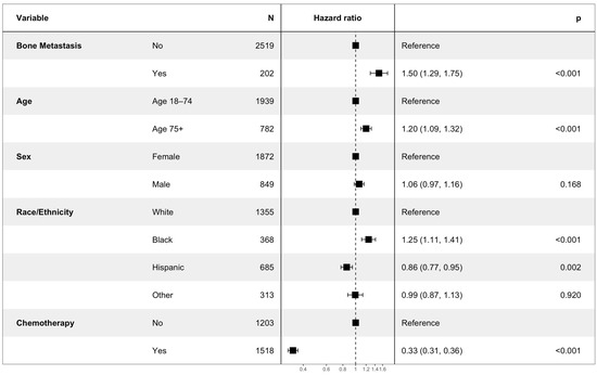 The multivariate Cox analysis showed that the factors associated with an increased risk of mortality included an age of more than 75 years (HR 1.20, CI 1.09–1.32, p < 0.001), bone metastasis (HR 1.50, CI 1.29–1.75, p < 0.001), and black race (HR 1.25, CI 1.11–1.41, p-value < 0.001). The factors that were associated with an improved OS included Hispanic race (HR 0.86, CI 0.77–0.95, p = 0.002), and treatment with chemotherapy (HR 0.33, CI 0.31–0.36, p < 0.001) (Figure 2).