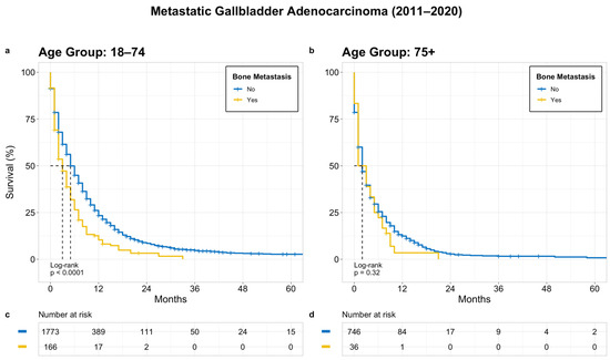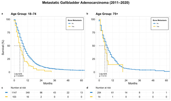 Figure 4. OS in patients with treated metastatic GB adenocarcinoma based on bone metastasis; (a) age 18–74 years, (b) age 75+ years, (c) and (d) denotes patients at risk at a given time point.