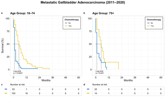 The following supporting information can be downloaded at: https://www.mdpi.com/article/10.3390/cancers15205055/s1, Figure S1: OS in patients with untreated metastatic GB adenocarcinoma based on bone metastasis; (a) age 18–74 years, (b) age 75+ years, (c,d) denotes patients at risk at a given time point; Figure S2: OS in patients with metastatic GBC based on receipt of chemotherapy; (a) age 18–74 years, (b) age 75+ years, (c,d) denotes patients at risk at a given time point.
