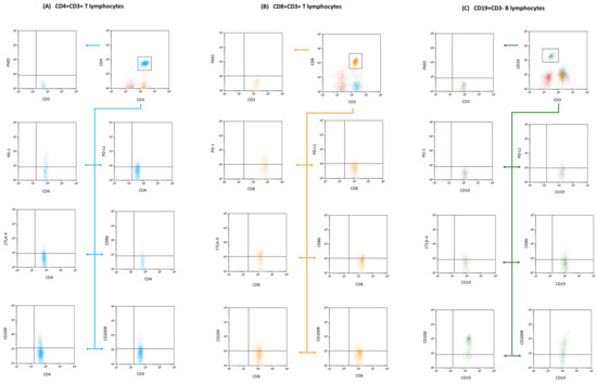 Flow cytometry gating and analysis strategy. This diagram showcases the gating approach that we used in our research to define lymphocyte subgroups. In detail, the subsets presented are (A) CD4+ CD3+ (indicated in blue); (B) CD8+ CD3+ (marked in orange); and (C) CD19+ CD3− (displayed in green). This categorization enabled the further investigation of unique immune checkpoint markers within each group.