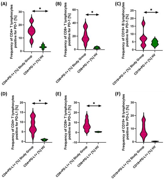 Evaluation of the percentages of T and B lymphocytes positively expressing PD-1 (A–C) and PD-L1 (D–F) in patients with antibody deficiencies with near-normal immunoglobulin levels or hyperimmunoglobulinemia relative to healthy volunteers. Statistically significant results are marked with *. Patients with antibody deficiencies with near-normal immunoglobulin levels or hyperimmunoglobulinemia are marked in pink, and the group of healthy volunteers without EBV reactivation is marked in green.