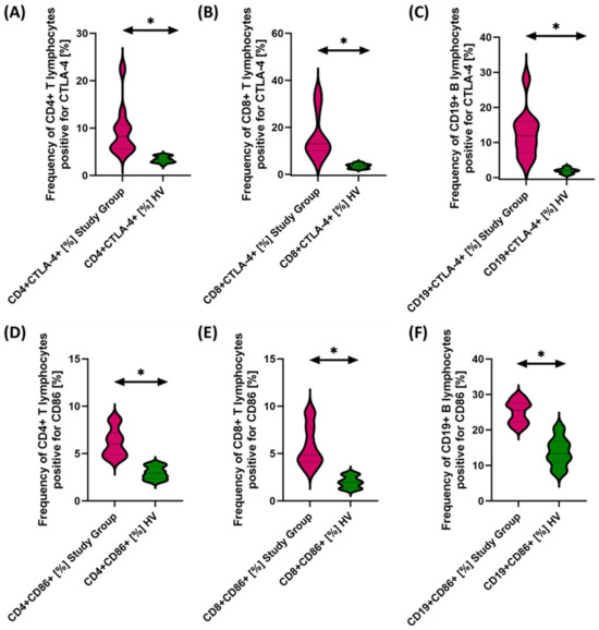 Evaluation of the percentages of T and B cells positive for CTLA-4 (A–C) and CD86 (D–F) expression in antibody deficiencies with near-normal immunoglobulin levels or hyperimmunoglobulinemia relative to healthy volunteers. Statistically significant results are marked with *. Pink indicates patients with antibody deficiencies with near-normal immunoglobulin levels or hyperimmunoglobulinemia, and green indicates the group of healthy volunteers without EBV reactivation.