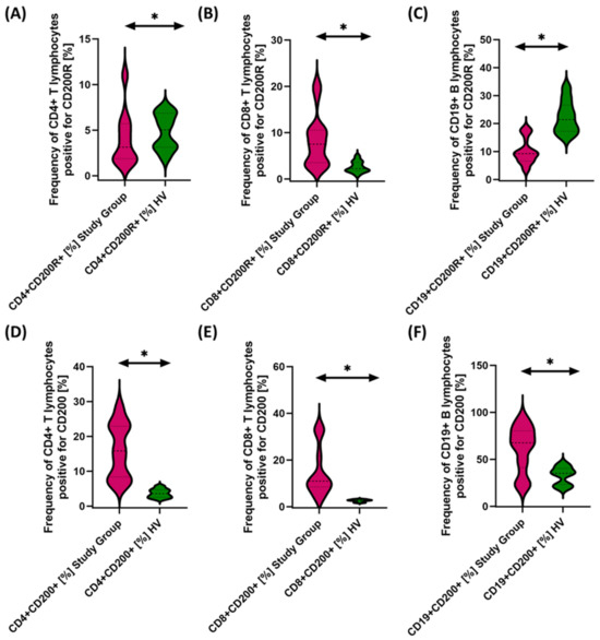 Evaluation of the percentages of T and B cells positively expressing CD200R (A–C) and CD200 (D–F) in patients with antibody deficiencies with near-normal immunoglobulin levels or hyperimmunoglobulinemia relative to healthy volunteers. Statistically significant results are marked with *. Pink indicates patients with antibody deficiencies with near-normal immunoglobulin levels or hyperimmunoglobulinemia, and green indicates the group of healthy volunteers without EBV reactivation.
