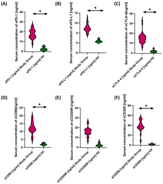 The soluble immune checkpoint and ligand concentrations in serum were assessed by conducting immunoenzymatic assays using serum samples collected from all participants. We used commercial kits for this purpose, as follows: human CD200 ELISA Kit (sensitivity: 20 pg/mL) (Invitrogen, Waltham, MA, USA); human CD200R ELISA Kit (sensitivity: 11.89 pg/mL) (Abcam, Cambridge, UK); human CTLA-4 ELISA Kit (Sensitivity: 0.13 ng/mL)(Invitrogen, Waltham, MA, USA); human CD86 ELISA Kit (Sensitivity: 0.82 ng/mL) (Invitrogen, Waltham, MA, USA); human PD-1 ELISA Kit (Sensitivity: 1.14 pg/mL) (Invitrogen, Waltham, MA, USA); and human PD-L1 ELISA Kit (Sensitivity: 0.6 pg/mL) (Invitrogen, Waltham, MA, USA). We measured the concentration of all tested molecules using a VictorTM3 reader (PerkinElmer, Waltham, MA, USA). The manufacturers’ instructions were followed when using the kits.