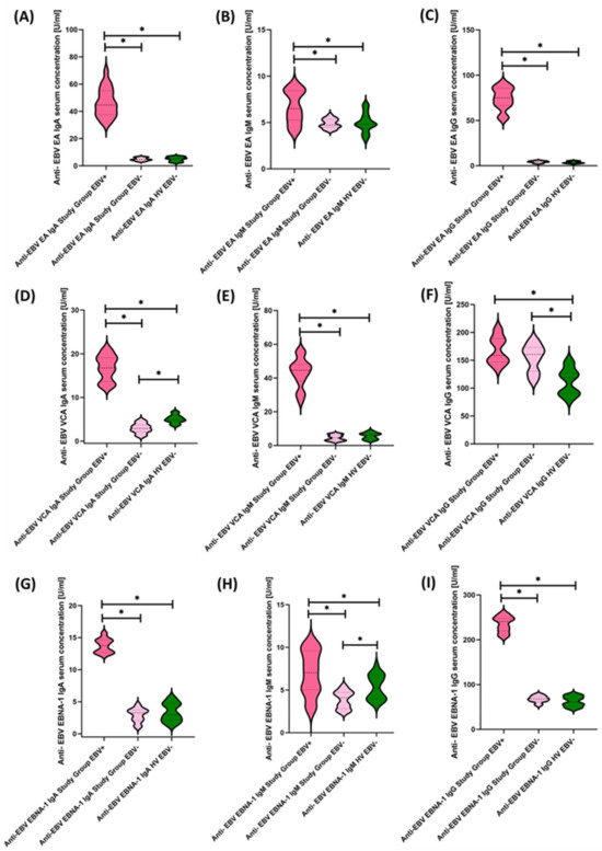 Evaluation of serological profiles related to EBV reactivation based on the concentrations of antibodies: anti-EBV EA in the class IgA (A), IgM (B), and IgG (C); anti-EBV VCA in IgA (D), IgM (E), and IgG (F) classes; anti-EBV EBNA-1 in IgA (G), IgM (H), and IgG (I) classes. Statistically significant results are marked with *. Dark pink represents patients with antibody deficiencies with near-normal immunoglobulin levels or hyperimmunoglobulinemia showing EBV reactivation, light pink represents patients with antibody deficiencies with near-normal immunoglobulin levels or hyperimmunoglobulinemia without EBV reactivation, and green indicates the group of healthy volunteers without EBV reactivation.
