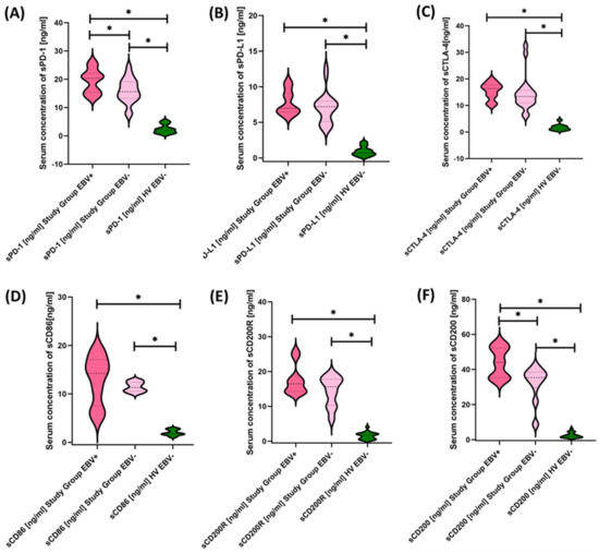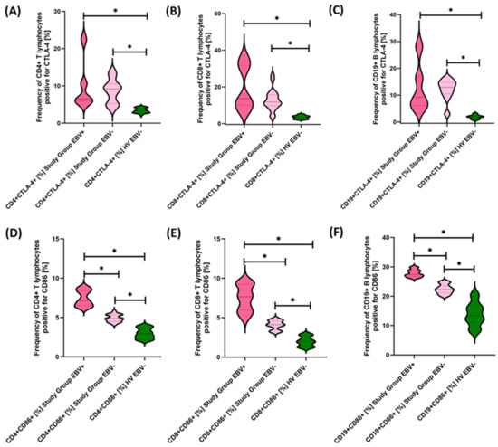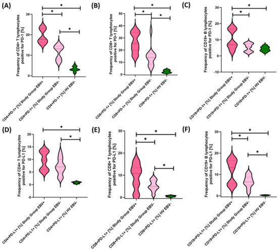 Our analyses show that statistically significant differences between EBV+ and EBV− patients within the study group were observed for CD4+ PD-1+, CD8+ PD-1+, CD19+ PD-1, CD8+ PD-L1+, and CD19+ PD-L1+ and for CD4+ CD8+, CD8+ CD86+, and CD19+ CD86+. All these differences were higher for EBV+ than for EBV− patients. Other observed changes were not statistically significant.