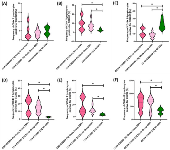Evaluation of the percentages of CD200R (A–C) and CD200 (D–F) positive T and B lymphocytes in patients with antibody deficiencies with near-normal immunoglobulin levels or hyperimmunoglobulinemia, considering EBV reactivation relative to healthy volunteers. Statistically significant results are marked with *. Dark pink represents patients with antibody deficiencies with near-normal immunoglobulin levels or hyperimmunoglobulinemia showing EBV reactivation, light pink represents patients with antibody deficiencies with near-normal immunoglobulin levels or hyperimmunoglobulinemia without EBV reactivation, and green indicates the group of healthy volunteers without EBV reactivation.