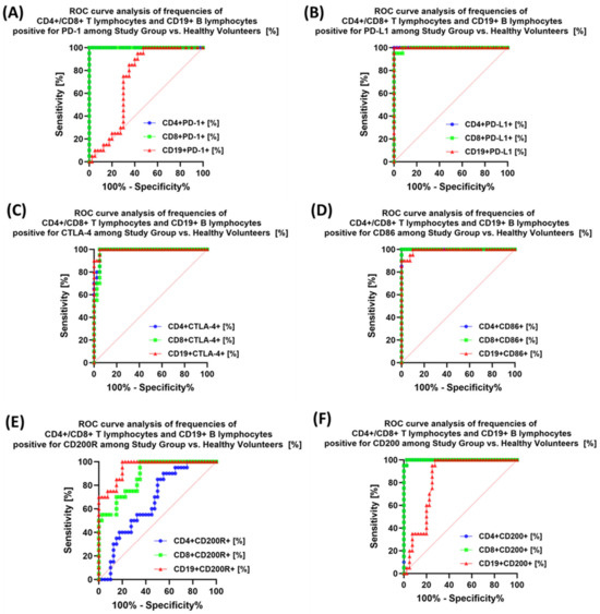 Analysis of ROC curves for the percentages of selected immune cells expressing PD-1 positive (A), PD-L1 (B), CTLA-4 (C), CD86 (D), CD200R (E), and CD200 (F) in patients with antibody deficiencies with near-normal immunoglobulin levels or hyperimmunoglobulinemia compared to healthy volunteers.