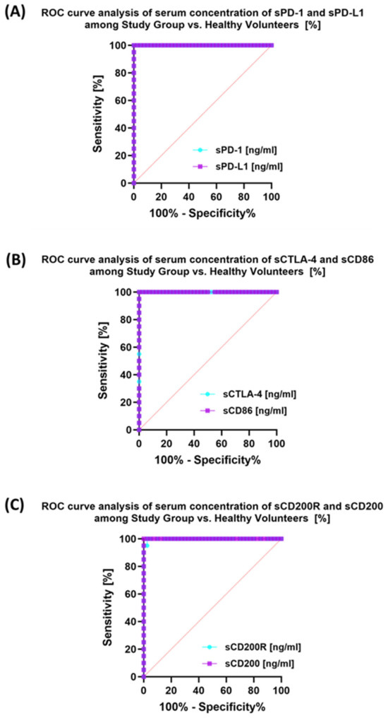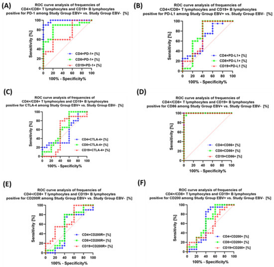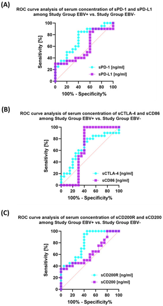 The last stage of the research was the sensitivity analysis of all tested parameters in terms of their usefulness as potential marker molecules, allowing for the diagnosis, monitoring, and assessment of EBV reactivation in all groups of patients. First, we analyzed using ROC curves the usefulness of the percentages of selected T and B lymphocytes positively expressing each of the tested molecules, considering the entire study group and the healthy volunteers. The results depicted in Figure 12 show that the most sensitive parameters are CD4+ PD-1+ and CD8+ PD-1+ (Figure 12A); CD4+ PD-L1+ and CD8+ PD-L1+ (Figure 12B); and CD4+ CD86+ and CD8+ CD86+ (Figure 12D). For the remaining parameters (Figure 12C,E,F), their diagnostic sensitivity was much lower. Hoveever in contrast, all analyzed concentrations of the individual soluble forms of the molecules tested also showed high sensitivity between the analyzed groups of patients (Figure 13A–C).