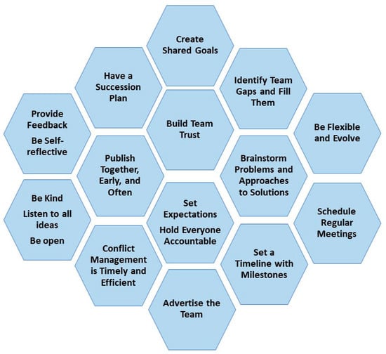 A successful team is one in which all members are held accountable. Accountability ensures that the team can not only meet their goals but also maintain avenues for open, transparent, and frequent communication and mutual respect amongst team members, but it can also be one of the challenging aspects of team management (Table 1) [17,18]. For each member to be accountable, expectations must be clear and reasonable. A regular meeting schedule can aid in maintaining accountability and provides the opportunity to give and receive feedback [11]. When setting up a meeting schedule, we suggest utilizing varied meeting formats (in person, virtual, hybrid), times, and days in order to determine what type of schedule fits the needs of the team. However, do not meet simply for the sake of meeting. Meetings should have a clear purpose with all members participating. Some examples of types of meeting formats are journal club meetings to learn new ideas and keep up to date in the field, quick status update meetings (status of papers, grants, administrative issues), and longer meetings to present works in progress to receive feedback among others [11,19,20]. Having an opportunity for the team to provide feedback is essential. Team leaders should be encouraged to provide feedback that is concrete, specific, descriptive, and fits into the shared goals of the team. In addition, in larger teams, developing a process to handle disagreements, before conflicts arise, may be beneficial.