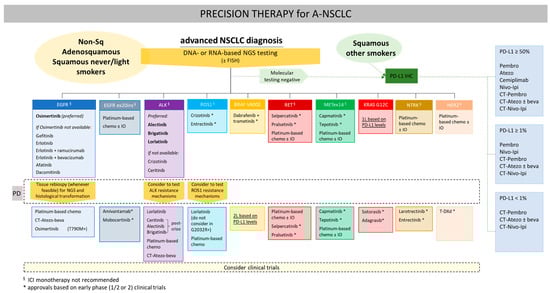 Current treatment options in advanced NSCLC according to molecular gene testing. Novel generations of TKIs, where available, were initially positioned in a therapeutic sequence, but they are established as front-line treatments across driver mutations. Drug classes: Tyrosine kinase inhibitors: Osimertinib, gefitinib, erlotinib, afatinib, dacomitinib, mobocertinib, alectinib, brigatinib, lorlatinib, ceritinib, crizotinib, entrectinib, selpercatinib, pralsetinib, capmatinib, tepotinib, larotrectinib|small molecule inhibitors: dabrafenib, trametinib, sotorasib, adagrasib|bispecific antibodies: amivantamab|Antibody-drug conjugates: trastuzumab-deruxtecan|Abbreviations: CT = chemotherapy; Atezo = atezolizumab; Pembro = pembrolizumab; Nivo = nivolumab|Ipi = ipilimumab|beva = bevacizumab.