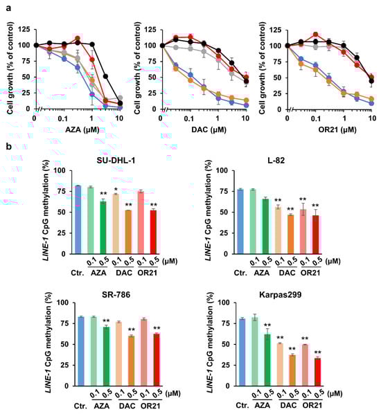 We first compared the efficacy of OR21 with that of the conventional DNA-demethylating agents, AZA and DAC, in ALCL cell lines in vitro. Treatment with AZA for 4 days inhibited cell growth in all four ALCL cell lines in a dose-dependent manner and to a similar degree; the 50% inhibitory concentration (IC50) values for SU-DHL-1, L-82, SR-786, and Karpas299 were 0.75, 0.85, 0.75, and 1.58 μM, respectively (Figure 1a). Although DAC also suppressed cell growth in a dose-dependent manner, it was less effective at inhibiting the growth of the SR-786 and Karpas299 cell lines than that of the SU-DHL-1 and L-82 cell lines; the IC50 values for SU-DHL-1, L-82, SR-786, and Karpas299 were 0.14, 0.08, 5.57, and 10 μM, respectively (Figure 1a). The treatment of primary human hepatocytes with AZA, DAC, and OR21 suppressed cell growth to some extent, possibly because the cells proliferated slowly (Figure 1a). The growth-inhibitory effect of OR21 in each cell line was almost the same as that of DAC (Figure 1a). We next measured the DNA methylation status of the LINE-1 promoter region, a surrogate maker for global DNA methylation status []. The level of LINE-1 promoter methylation was ~80% in all four cell lines (Figure 1b). Although the treatment of cells with AZA, DAC, or OR21 for four days reduced LINE-1 promoter methylation, this decrease in methylation was not related to the extent of cell growth inhibition (Figure 1b).