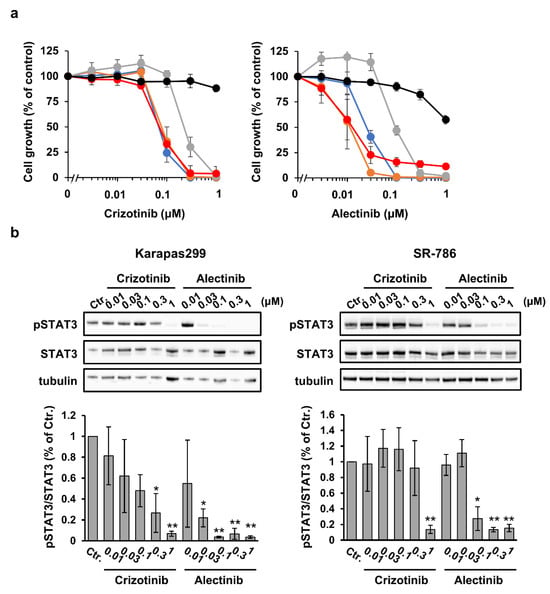 ALK TKIs inhibit the proliferation of ALCL cell lines in vitro. ALCL cell lines were treated with crizotinib or alectinib for 4 days. (a) The proliferation of the ALCL cells lines (SU-DHL-1: blue, L-82: orange, SR-786: gray, and Karpas299: red) and human primary hepatocytes (black) was determined using the CCK-8 assay; the proliferation value of untreated cells was set at 100%. The results are expressed as the mean ± SD of three independent experiments. (b) Immunoblots showing the phosphorylation status of STAT3 in cells exposed to the indicated treatment conditions. The signal intensities of phosphorylated STAT3 (Tyr705, pSTAT3) in the Western blotting results were measured and then divided by the intensity of STAT3. The uncropped blots are shown in File S1. The proportion of pSTAT3 in non-treated cells was defined as 100%. The results are the means of three independent experiments. The differences between the control and each treatment group were tested using the Dunnett test. * p < 0.05, ** p < 0.01.