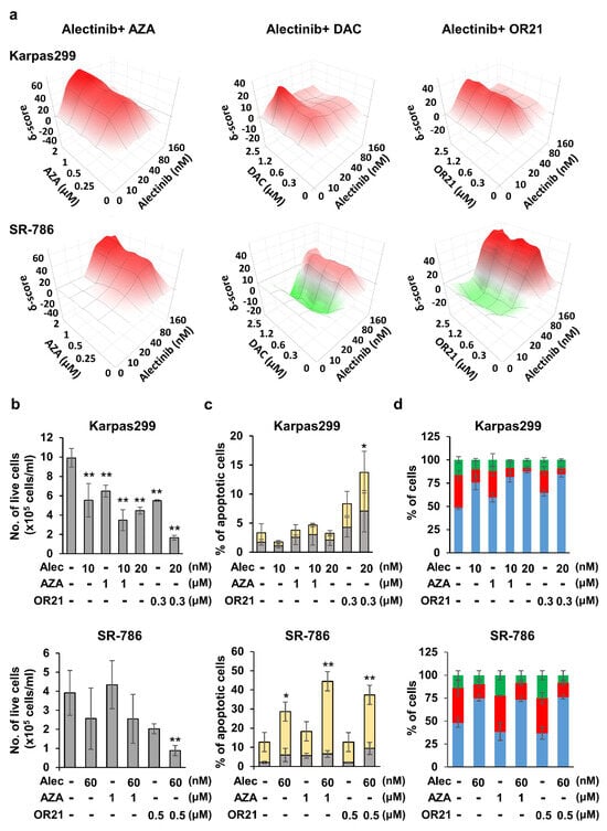 Since alectinb was more effective than crizotinib at inhibiting the growth of ALK+ ALCL cell lines in our in vitro experiments (Figure 2), we decided to focus on it for the remainder of the study and test it in combination with DNA-demethylating agents. Hence, the Karpas299 and SR-786 cell lines (Figure 3a) and the other two ALK+ ALCL cell lines (Supplementary Figure S1a) were treated with different concentrations of the DNA-demethylating agents (AZA, DAC, or OR21) or alectinib, either alone or with alectinib in combination with each of the DNA-demethylating agents. We subsequently calculated the magnitude of synergistic growth-inhibitory effects, which was expressed as a ZIP score using the SynergyFinder web application. The combination of a DNA-demethylating agent and alectinib induced synergistic effects (ZIP score > 10) at some of the concentration ranges in all four of the cell lines tested. Although the monotherapy of DNA-demethylating agents slightly suppressed the growth of normal hepatocytes, the addition of ALK TKIs did not increase the efficacy (Supplementary Figure S1b). In Karpas299 cells, the strongest synergistic effect was obtained with a combination of 10–20 nM alectinib and 1–2 μM AZA, 1.2–2.5 μM DAC, or 0.3–1.2 μM OR21. In SR-786 cells, the strongest synergistic effect was obtained with a combination of 40–160 nM alectinib and 0.5–2 μM AZA, 0.3–2.5 μM DAC, or 0.3–2.5 μM OR21. Since the pharmacological action of OR21 is derived from the release of DAC following OR21 processing, and OR21 showed less hematotoxicity than DAC in a mouse model, we chose to focus on AZA and OR21 in further experiments. We found that treating Karpas299 and SR-786 cells with a combination of alectinib and AZA or OR21 inhibited cell proliferation (Figure 3b) and induced apoptosis (Figure 3c) associated with the induction of cleaved caspase 3 (Supplementary Figure S2) more strongly than treatment with each agent alone. However, no synergistic effect on the induction of cell cycle arrest was observed (Figure 3d).