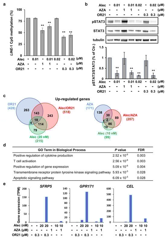 Global gene expression changes induced by the combination of alectinib and DNA-demethylating agents. Karpas299 cells were treated with each compound alone or in combination for 3 days. (a) The degree of LINE-1 promoter methylation was determined via bisulfite pyrosequencing. The results are expressed as the mean ± SD of three independent experiments. ** p < 0.01. (b) Immunoblots showing the phosphorylation status of STAT3 in cells under different treatment conditions. The signal intensities of pSTAT3 in the Western blotting results were measured and then divided by the intensity of STAT3. The proportion of pSTAT3 in non-treated cells was defined as 100%. The results are the means of three independent experiments. Differences between the control and each treatment group were tested using the Dunnett test. The uncropped blots are shown in File S1. ** p < 0.01. (c) Venn diagrams showing the number of up-regulated (≥5 fold change) genes relative to the control. (d) The top 5 most significantly enriched GO terms obtained from the analysis of up-regulated genes in Karpas299 cells treated with the combination of alectinib with OR21. (e) Normalized expression levels (transcripts per million, TPM) of the SFRP5, GPR171, and CEL genes, obtained from the analysis of RNA-seq data.