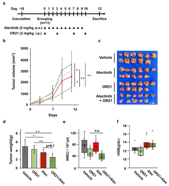 The anti-ALCL effect of OR21 and alectinib in a Karpas299 xenograft mouse model. (a) The experimental protocol for the establishment of the Karpas299 xenograft mouse model and treatment with alectinib and/or OR21. Karpas299 cells were subcutaneously inoculated into NOG mice and treated with vehicle (10% HP-β-CD containing 1% dimethyl sulfoxide, intraperitoneally, twice per week and 0.02N HCL, 10% DMSO, 10% CremophorEL, 15% PEG400, and 15% HP-β-CD, oral gavage, daily, n = 11), OR21 (2 mg/kg, intraperitoneally, twice a week, n = 11), alectinib (2 mg/kg, oral gavage, daily, n = 11), or OR21 + alectinib (2 mg/kg OR21 and 2 mg/kg alectinib, n = 11), as indicated by the arrowheads. (b) The mean of tumor volume in NOG mice was measured twice per week, starting on Day 0. Vehicle; grey, OR21; light green, alectinib; red, OR21+alectinib; dark green. (c) Tumors were isolated from mice sacrificed on Day 13. (d) The weight of the isolated tumors was measured. (e) The number of white blood cells (WBCs) and (f) the concentration of hemoglobin (HGB) from NOG mice 13 days after the first administration of compounds were determined. Differences between each group were tested using the Tukey test. * p < 0.05, ** p < 0.01, n.s.: no significance.