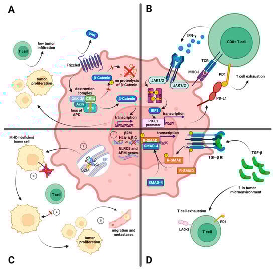 Overview of tumor intrinsic factors related to immune evasion and ICI resistance. (A) WNT/β-catenin signaling pathway: the loss of the adenomatous polyposis coli (APC) gene leads to increased β-catenin levels and activation of the WNT signaling pathway, which subsequently results in altered T-cell responses, a significant decrease in tumor-infiltrating lymphocytes, and tumor proliferation; (B) Interferon-γ (IFN-γ) signaling: IFN-γ facilitates tumor cell apoptosis and enhances the expression of the major histocompatibility complex class I (MHC-I) and programmed cell death ligand 1 (PD-L1) through the action of Janus Kinases (JAKs). The latter is essential for IFN-γ signaling, and mutations in JAK can lead to reduced tumor cell apoptosis in response to IFN-γ, the diminished expression of MHC-I, and T-cell exhaustion due to PD-L1 overexpression; (C) Antigen-presenting machinery (APM): (1) intra-tumor mechanisms such as mutations, loss of heterozygosis (LOS), or deletions in the β2M gene, as well as in the HLA-A, -B, and -C genes, trigger the loss of MHC-I. (2) Likewise, the improper assembling of β2M and alpha chains inside the endoplasmic reticulum lead to the unsuccessful expression of MHC-I. (3) In those situations, MHC-I-deficient tumor cells are not recognized by CD8+ T cells. (4) This results in an escape from immunological recognition. (5) This opens the way for proliferation and migration to different tissues; (D) Transforming growth factor beta (TGF-β): Mutations in either the TGF-β receptor or its downstream target, SMAD4, can result in a surge of TGF-β levels. Elevated levels of TGF-β could lead to the exhaustion of T cells and induce resistance to ICI treatment (created with BioRender.com).
