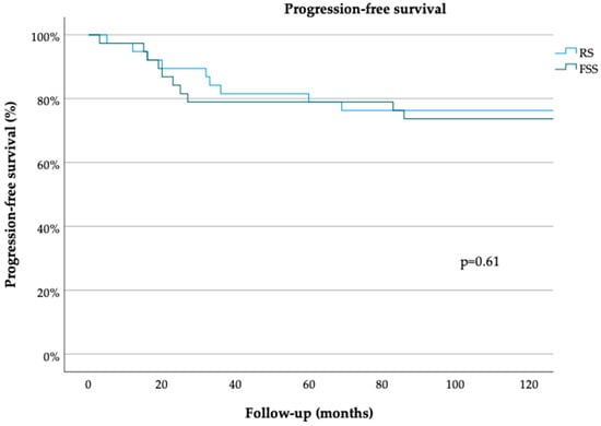 Progression-free survival for minimally invasively treated patients with early ovarian cancer. Radical surgery (RS), fertility-sparing surgery (FSS) (log-rank test).