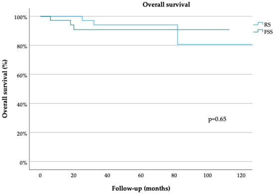 Overall survival for minimally invasively treated patients with early ovarian cancer. Radical surgery (RS), fertility-sparing surgery (FSS) (log-rank test).