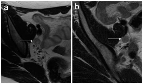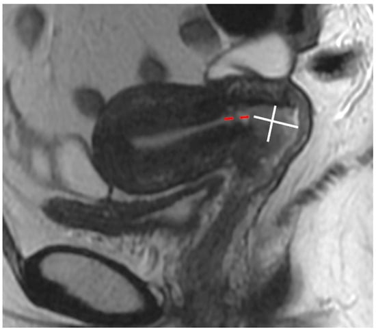 Fertility-sparing surgery includes cone resection/cone biopsy, simple trachelectomy, or radical trachelectomy [39]. As well as tumour size, other criteria must also be met to be eligible: the distance between the cranial margin of the tumour and internal os should be greater than 1 cm; however, some centres accept a minimum distance of 0.5 cm [45]. MRI has a reported sensitivity of 91% and specificity of 97% in the evaluation of internal os involvement [46]. On sagittal T2WI, the internal os is seen as the narrowest point of the uterine body or the transition point where the low-signal intensity cervical stroma changes to the higher-signal intensity uterine myometrium. The distance between the superior margin of the tumour and the internal os is measured in the sagittal plane [47,48] (Figure 13).
