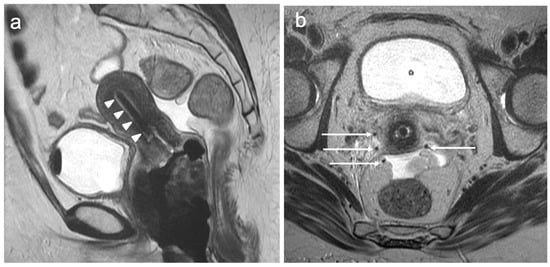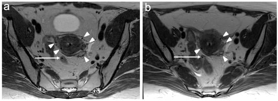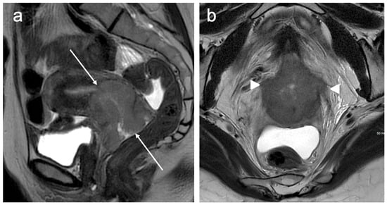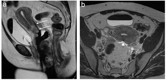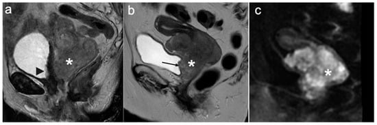- Akita, A.; Shinmoto, H.; Hayashi, S.; Akita, H.; Fujii, T.; Mikami, S.; Tanimoto, A.; Kuribayashi, S. Comparison of T2-weighted and contrast-enhanced T1-weighted MR imaging at 1.5 T for assessing the local extent of cervical carcinoma. Eur. Radiol. 2011, 21, 1850–1857. [Google Scholar] [CrossRef]