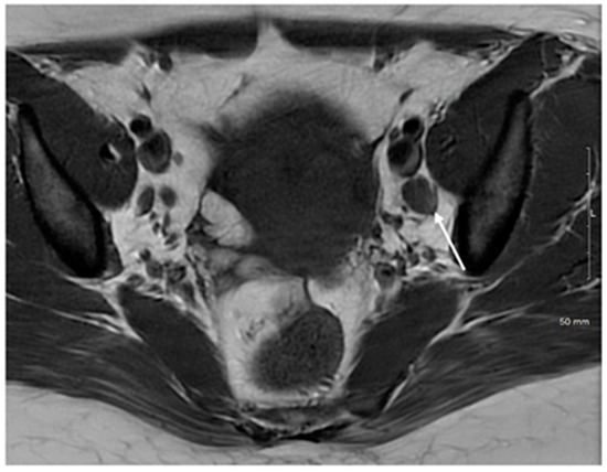 Axial T1WI demonstrating an enlarged left obturator node (arrow). FIGO stage IIIC1.