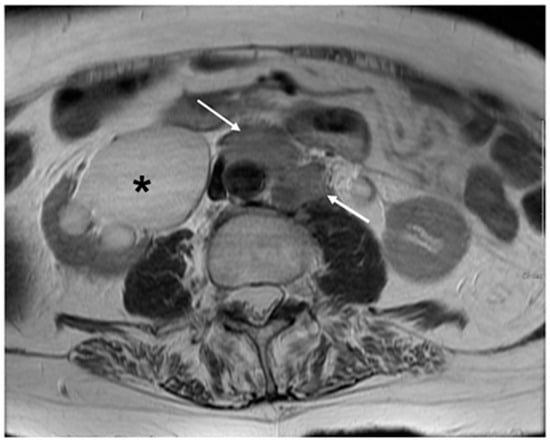 Axial T1WI demonstrating enlarged left para¬aortic and pre-aortic nodes (arrows). FIGO stage IIIC2. Right sided hydronephrosis also noted (*).