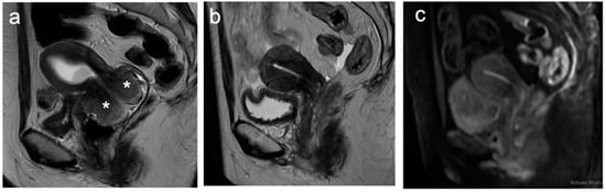 The standard treatment for locally advanced cervical cancer (stage IIB and above) is chemoradiotherapy, which involves external beam radiation (EBRT) with concurrent chemotherapy, followed by intracavitary brachytherapy. MRI can be used to assess for accurate placement of the brachytherapy applicators (Figure 14) and post-brachytherapy complications (Figure 15 and Figure 16). For patients treated with chemoradiotherapy, interval imaging can be used to monitor disease response (Figure 17). Mid-treatment MRI (after approximately 5 weeks of commencing chemotherapy with EBRT and before intracavitary brachytherapy) can aid dose adjustment in proportion to the residual tumour volume, which can reduce toxicity. Post-treatment MRI is typically performed 3–6 months after chemoradiotherapy, and the reconstitution of the low-signal intensity cervical stroma on T2WI implies a complete response. Post-treatment changes can persist for up to 9 months post-chemoradiotherapy; therefore, distinguishing residual tumours from post-treatment oedema can be challenging as both will appear as intermediate signal intensities on T2W1. The use of DWI can help differentiate the two, as only tumours should demonstrate restricted diffusion [50]. More recently, the application of MRI-guided brachytherapy has been shown to deliver more accurate dosing, which can be individually tailored to the tumour volume, thereby improving overall morbidity [51,52,53].