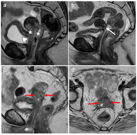 - Valentini, A.L.; Gui, B.; Miccò, M.; Giuliani, M.; Rodolfino, E.; Ninivaggi, V.; Iacobucci, M.; Marino, M.; Gambacorta, M.A.; Testa, A.C.; et al. MRI anatomy of parametrial extension to better identify local pathways of disease spread in cervical cancer. Diagn. Interv. Radiol. 2016, 22, 319–325. [Google Scholar] [CrossRef]