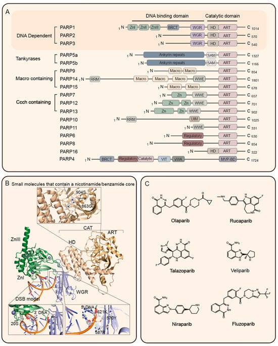PARP family and PARPi. (A) Schematic diagram of domain architecture of PARP family members; (B) schematic of the domains of PARP1 (upper panel); crystal structure of PARP1 bound to double-strand DNA (PDB: 4DQY) (lower panel); (C) the chemical structures of FDA-approved PARPi. Abbreviations: CCCH, Cys-Cys-Cys-His; BRCT, breast cancer susceptibility gene C terminus; ZnI, ZnII, ZnIII, and Zinc finger; WGR, Tryptophan—Glycine–Arginine; HD, helical domain; macro, macrodomain; ART, Ankyrin repeat domains; RRM, RNA recognition motif; UIM, ubiquitin interaction motif; VIT, Vault protein Inter-Alpha-Trysin; WWE, Tryptophan–Tryptophan–Glutamiac; vWA, von Willebrand type A; MVP-BD, Major-vault particle binding domain.