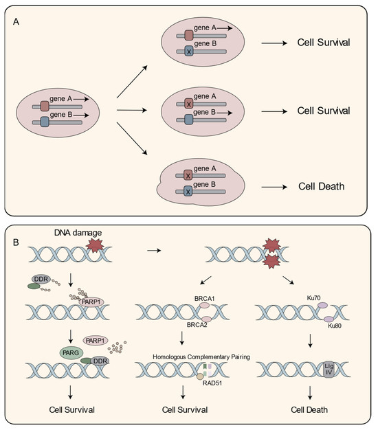 The impressive tumor-specific cytotoxicity of PARPi are rooted in the pioneering concept of “synthetic lethality” proposed in the preceding century [46,47]. Traditionally, gene A and gene B operate independently in normal physiological conditions. However, while the disruption of either gene alone is tolerable, the simultaneous perturbation of both genes leads to nonviable cells, giving rise to an intriguing interplay between the two genes and resulting in a synthetic lethal interaction (Figure 2A) [48,49].