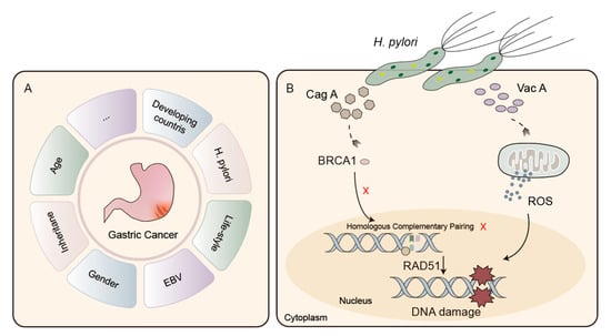 The complex interplay between H. pylori and GC encompasses two crucial dimensions. First and foremost, mirroring the pathogenicity witnessed in diverse microbial infections, the inception of chronic inflammation assumes a central role in driving malignant changes. Additionally, H. pylori harnesses its virulence determinants, notably the cytotoxin-associated gene A (CagA) and vacuolating cytotoxin A (VacA), to trigger DNA damage and hinder the mechanisms of HRR (Figure 3B) [85]. Within the realm of H. pylori infection within the gastric mucosa, whether it be chronic gastritis or intestinal metaplasia, CagA prompts a depletion of BRCA1 in the nucleus. This depletion then triggers the initiation of double-strand DNA breaks and interferes with the functioning of homologous recombination mechanisms. As a result, this series of steps culminates in the destabilization of the genome and expedites the advancement of gastric carcinogenesis [86]. Concurrently, VacA initiates endoplasmic reticulum (ER) stress, disturbs autophagy, and incites apoptosis [76]. Significantly, it is worth highlighting that the generation of reactive oxygen species (ROS) induced by VacA can amass within gastric epithelial cells due to the influence of various virulence factors originating from H. pylori. Consequently, this ROS accumulation leads to DNA damage within the host genome, thereby fostering the progression of GC [87].