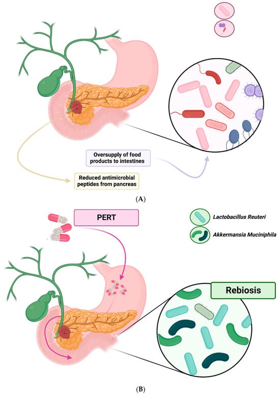 It is likely that the gut microbiome of pancreatic cancer patients with PEI exhibits profound dysbiosis and that this may potentially be reversible with PERT. However, further research is needed to conclude if this is indeed the case. Future research should seek to elucidate the specific changes that occur in PC patients with PEI as these are likely to be different to gut microbiome changes in patients with other, benign causes of PEI such as cystic fibrosis or CP. It would also be important to investigate whether the gut microbiome of PC patients who have PEI treated with PERT experience a return of gut microbiome towards that of healthy controls. It is also important to acknowledge that supplements, such as probiotics as well as faecal microbiota transplantation, can influence the composition of the gut microbiome and therefore may also be beneficial in PC [111].