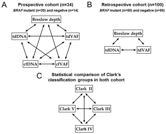 Breslow’s depth and Clark’s level were used for the classification of the patients. In addition to the histological assignment, we also examined the mutational status (BRAF p.V600E mutant or negative) using the dPCR method. Correlation analyses were performed in pro- and retrospective cohorts between tumor BD, tdDNA, cfDNA, tdVAF of BRAF p.V600E, and cfVAF. The analyses were applied in all cases, including mutant and negative BRAF patients. Statistical analyses were applied to compare Clark’s levels groups using the above-mentioned parameters. The study design is presented in Figure 1.