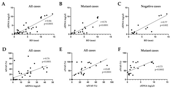 Graphical presentation of the results of correlation analyses in the prospective cohort. A strong positive correlation (r > 0.6) was confirmed between BD and cfDNA concentration in all (A), mutant (B), and negative (C) cases. There is also a strong correlation between the tdDNA concentration and the tdVAF (D), between the tdVAF and the cfVAF (E) in all cases, and between the cfDNA and cfVAF in mutant cases (F). BD: Breslow depth, tdDNA: tumor-derived DNA, cfDNA: cell-free DNA, tdVAF: tumor-derived variant allele frequency of BRAF p.V600E mutation, cfVAF: cell-free variant allele frequency of BRAF p.V600E mutation.