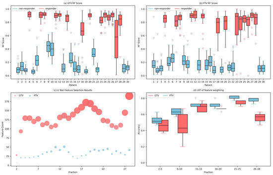 Random forest model yielded AUCs of 0.98 (95% CI [0.97, 0.99]) and 0.9867 (95% CI [0.969, 1.0]), respectively, for GTV and PTV regions through LOOCV in 27 experiments. Figure 3a,b are the box plots of RF scores in 27 experiments for the GTV and PTV regions, respectively. The red box are responders, and the blue box are non-responders. Significant differences were observed in RF scores among responders and non-responders. Figure 3c visualizes the number of features retained after the U-test. Figure 3d illustrates the trend of the accuracy rate change with the increase in the number of treatments with every five treatments used as a group statistically. Before the 15th fraction, the accuracy increases with increasing fractions, after the 15th fraction, the predictive accuracies becomes more stable. Although the GTV regions preserve more features than the PTV regions, the overall accuracy of the GTV area is lower than that of the PTV area, as it can be seen from Figure 3d.